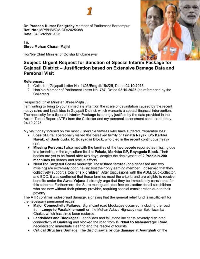 ଫେରିବା ପରେ ତୁରନ୍ତ ଗଜପତି ଜିଲ୍ଲାରେ ବିଭିନ୍ନ ସ୍ଥାନରେ ସମ୍ପ୍ରତି ପ୍ରବଳ ବର୍ଷା ଏବଂ ଭୂସ୍ଖଳନ ଅଞ୍ଚଳ ପରିଦର୍ଶନ କରି ହୋଇଥିବା ଜୀବନହାନି ଓ କ୍ଷୟକ୍ଷତିର ପରିମାଣ ସମ୍ପର୍କରେ ଓଡ଼ିଶାର ମାନ୍ୟବର ମୁଖ୍ୟମନ୍ତ୍ରୀ ଶ୍ରୀ ମୋହନ ଚରଣ ମାଝୀଙ୍କୁ ପତ୍ର (ପତ୍ର ନମ୍ବରMP/BHM/CM-OD/2025/088, ତାରିଖ – 04/10/2025) ମାଧ୍ୟମରେ ଜଣାଇଥିବା ଡ଼ ପାଣିଗ୍ରାହୀ କହିଛନ୍ତି। ସେହିପରି ଗଜପତି ଜିଲ୍ଲାପାଳଙ୍କ ଓ ସାଂସଦଙ୍କ ବ୍ୟକ୍ତିଗତ ମୂଲ୍ୟାଙ୍କନ ଆଧାରରେ ପ୍ରଦତ୍ତ କ୍ଷୟକ୍ଷତି ତଥ୍ୟ ଆଧାରରେ ଏକ ସ୍ୱତନ୍ତ୍ର ମଧ୍ୟବର୍ତ୍ତୀକାଳୀନ ଆର୍ଥିକ ପ୍ୟାକେଜ ଯୋଗାଇବାକୁ ମାନ୍ୟବର ମୁଖ୍ୟମନ୍ତ୍ରୀଙ୍କୁ ସେ ଅନୁରୋଧ କରିଥିବା ସାଂସଦ ଡ଼ ପାଣିଗ୍ରାହୀ ସୂଚନା ଦେଇଛନ୍ତି। ବ୍ରହ୍ମପୁର ସାଂସଦଙ୍କ ଏଭଳି କାର୍ଯ୍ୟକୁ ସାଧାରଣରେ ପ୍ରଶଂସା କରାଯାଉଛି।