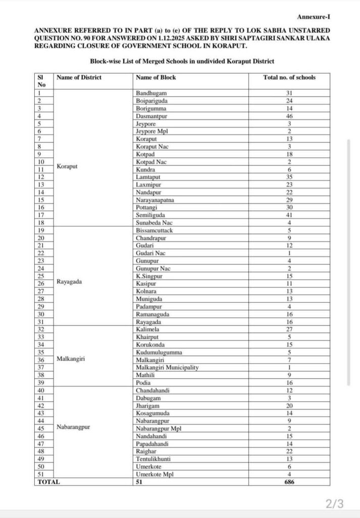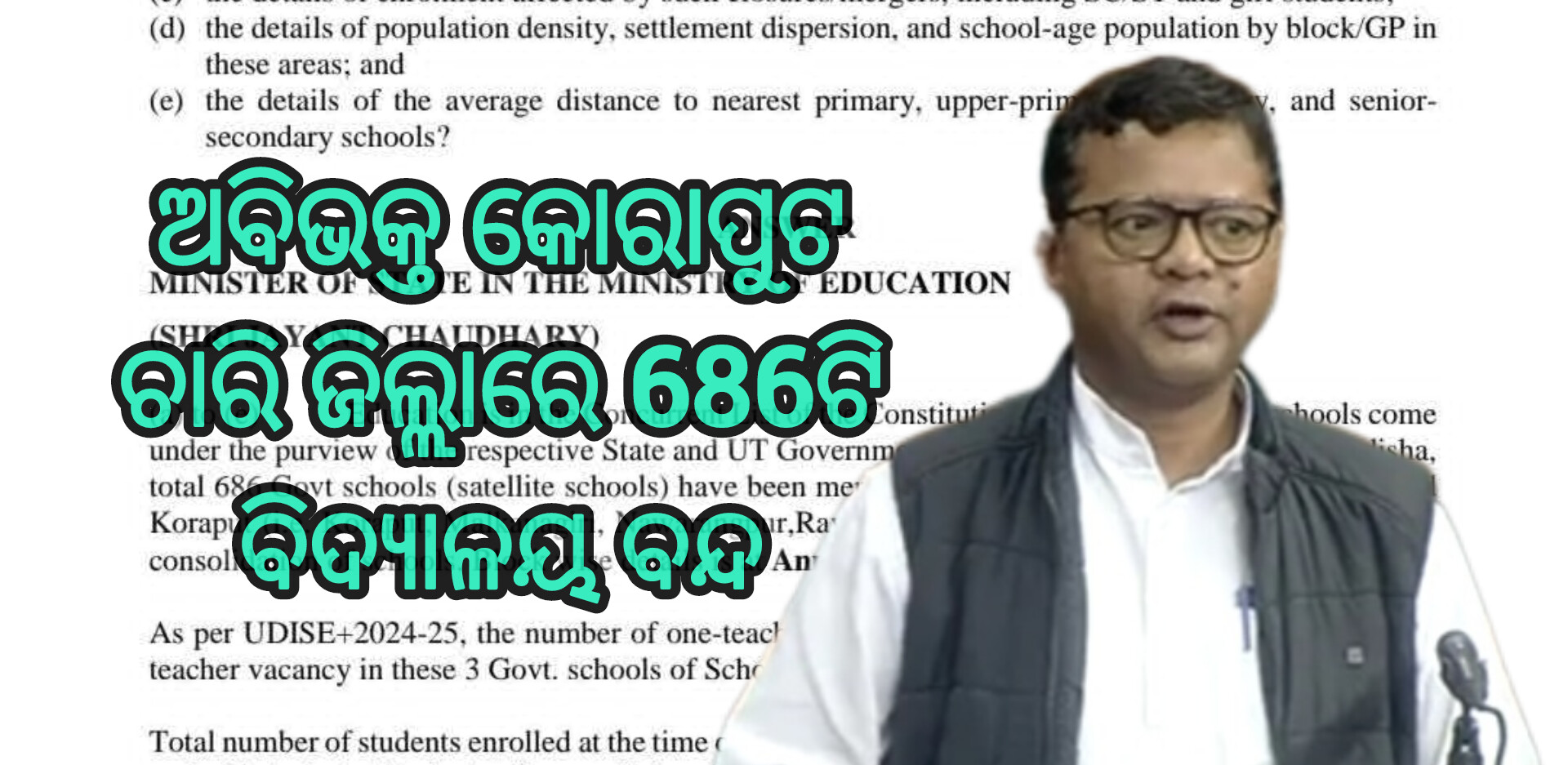 ଅବିଭକ୍ତ କୋରାପୁଟ ଜିଲ୍ଲାରେ ଶିକ୍ଷାର କରୁଣ ଚିତ୍ର। ବନ୍ଦ ହେଉଛି ବିଦ୍ୟାଳୟ। ସ୍ଥାନାନ୍ତରିତ ହେଉଛନ୍ତି ଛାତ୍ରଛାତ୍ରୀ। ଗତ ପାଞ୍ଚ ବର୍ଷରେ କୋରାପୁଟ ମାଳଭୂମିରେ ବନ୍ଦ ହୋଇଛି 686ଟି ବିଦ୍ୟାଳୟ ଏବଂ ଏଥିରେ ପଢ଼ୁଥିବା 8545 ଜଣ ପିଲା ନିକଟବର୍ତ୍ତୀ ବିଦ୍ୟାଳୟ ଗୁଡିକରେ ନାମଲେଖା ଯାଇଛି। ଏଭଳି ଏକ ଉତ୍ତର ରଖିଛନ୍ତି କେନ୍ଦ୍ର ଶିକ୍ଷା ମନ୍ତ୍ରଣାଳୟର ରାଜ୍ୟ ମନ୍ତ୍ରୀ ଶ୍ରୀ ଜୟନ୍ତ ଚୌଧୁରୀ। କୋରାପୁଟ ସାଂସଦ ସପ୍ତଗିରି ଉଲ୍ଲାକାଙ୍କ ଏକ ପ୍ରଶ୍ନର ଉତ୍ତର ଦେଇ କେନ୍ଦ୍ର ଶିକ୍ଷା ମନ୍ତ୍ରୀ ଉତ୍ତର ରଖିଛନ୍ତି। ତଥ୍ୟ ମୁତାବକ ମନ୍ତ୍ରୀ କହିଛନ୍ତି ଯେ ଶିକ୍ଷା ସମ୍ବିଧାନର ସମକାଳୀନ ତାଲିକାରେ ଅଧିକାଂଶ ବିଦ୍ୟାଳୟ ସମ୍ପୃକ୍ତ ରାଜ୍ୟ ଏବଂ କେନ୍ଦ୍ର ଶାସିତ ପ୍ରଦେଶ ସରକାରଙ୍କ ଅଧୀନରେ ଆସେ। ଓଡ଼ିଶା ରାଜ୍ୟ ସରକାରଙ୍କ ସୂଚନା ଅନୁଯାୟୀ ବିଦ୍ୟାଳୟଗୁଡ଼ିକର ଯୁକ୍ତିଯୁକ୍ତୀକରଣ ଏବଂ ଏକୀକରଣ ନୀତି ଅନୁଯାୟୀ ମୋଟ 686ଟି ସରକାରୀ ବିଦ୍ୟାଳୟ (ସାଟେଲାଇଟ୍ ସ୍କୁଲ) ଅବିଭକ୍ତ କୋରାପୁଟ (ଯଥା କୋରାପୁଟ, ମାଲକାନାଗିରି, ନବରଙ୍ଗପୁର, ରାୟଗଡ଼ା)ରେ ପ୍ରମୁଖ ସରକାରୀ ବିଦ୍ୟାଳୟ ସହିତ ମିଶ୍ରଣ କରାଯାଇଛି।