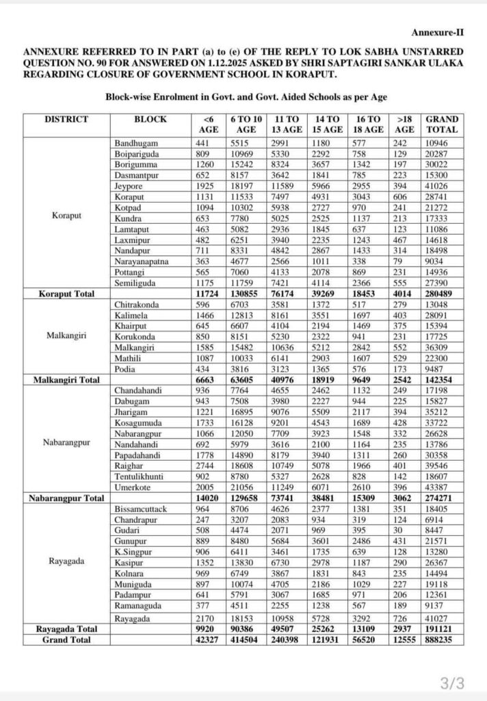 UDISE+2024-25 ଅନୁଯାୟୀ, ଅବିଭକ୍ତ କୋରାପୁଟ ଜିଲ୍ଲାରେ ଏକକ ଶିକ୍ଷକ ଥିବା ବିଦ୍ୟାଳୟର ସଂଖ୍ୟା 3। ଏହି 3ଟି ସରକାରୀ ବିଦ୍ୟାଳୟରେ ମୋଟ ଶିକ୍ଷକ ଖାଲି ପଡ଼ିଛି। ସ୍କୁଲ ଏବଂ ଗଣଶିକ୍ଷା ବିଭାଗର ସ୍କୁଲ ସଂଖ୍ୟା ହେଉଛି 3 (ତିନି)। ସ୍କୁଲ ବନ୍ଦ ହେବା/ମିଶ୍ରଣ ହେବା ସମୟରେ ପଞ୍ଜୀକୃତ ଛାତ୍ରଛାତ୍ରୀଙ୍କ ସଂଖ୍ୟା ହେଉଛି SC/ST ଏବଂ ବାଳିକା ଛାତ୍ରୀଙ୍କ ସମେତ 8545। ମିଶ୍ରିତ ବା ବନ୍ଦ ସ୍କୁଲର ଛାତ୍ରଛାତ୍ରୀ ନିକଟସ୍ଥ ସ୍କୁଲରେ ପଞ୍ଜୀକୃତ ହୋଇଛନ୍ତି। ଅବିଭକ୍ତ କୋରାପୁଟ (ଯଥା କୋରାପୁଟ, ମାଲକାନାଗିରି, ନବରଙ୍ଗପୁର, ରାୟଗଡା) ର ଜନସଂଖ୍ୟା ଘନତା ଅନୁସାରେ କୋରାପୁଟ 157/ବର୍ଗ କିଲୋମିଟର, ମାଲକାନଗିରି 106/ବର୍ଗ କିଲୋମିଟର, ନବରଙ୍ଗପୁର – 231/ବର୍ଗ କିଲୋମିଟର