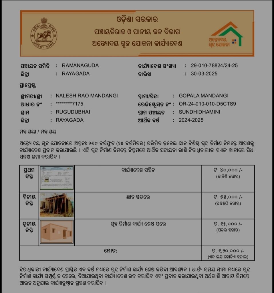 Rayagada district administration extended its support for the successful implementation of the scheme. Beneficiaries will get an additional incentive of Rs 45,000 set by the government by building a house within the time limit. The Antyoday Gruha Yojana has a provision to provide Rs 1,20,000 to the beneficiaries in three installments as per the rules. Due to the timely cooperation of the Ramnaguda Block Administration and sincere help of the Panchayat Executive Officer, the father of the disabled beneficiary, Nalesh Rao, has succeeded in building a brick and mortar house within 2 months of receiving the work order, overcoming all the adverse circumstances.