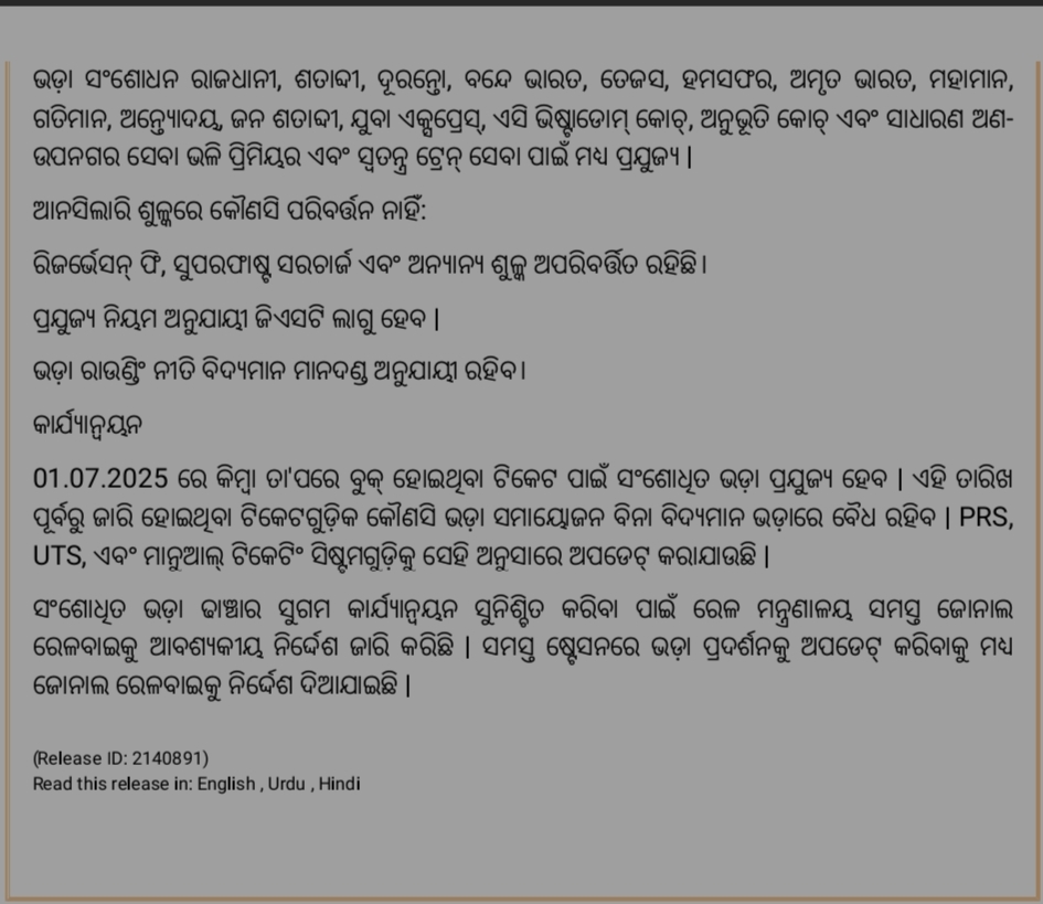 ଜୁଲାଇ ପହିଲାରୁ ରେଳ ଯାତ୍ରା ହେଲା ମହଙ୍ଗା, ରେଳ ବିଭାଗ ଜାରି କଲା ଦର ତାଲିକା